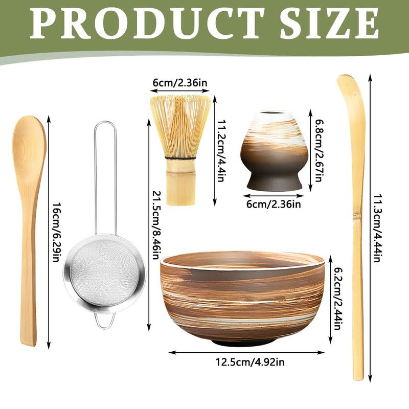 - Product Includes: 1 x Matcha Whisk, 1 x Matcha Bowl, 2 x Matcha Spoon, 1 x Whisk Holder, 1 x Sifter. The matcha set size is appropriate and easy to carry, so that you can enjoy the beauty of matcha anytime, anywhere. Its elegant design, complete accessories, and first-class craftsmanship will surely amaze matcha lovers