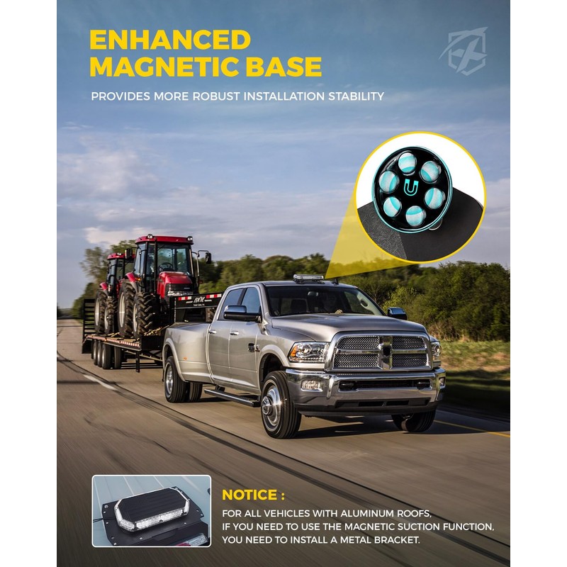 - Heavy-Duty Magnetic Mounting: Simplify installation with the heavy-duty magnetic mounts of this lightbar. The 4 strong magnetic feet, equipped with protective suction cup rubber padding, ensure a secure attachment to any metal rooftop. Benefit from enhanced stability and reduced air resistance due to the low-profile design, making it easier to communicate warning messages effectively in emergency situations or to draw attention to work areas. The reliable magnetic mounting system guarantees a hassle-free and durable solution for your vehicle lighting needs.