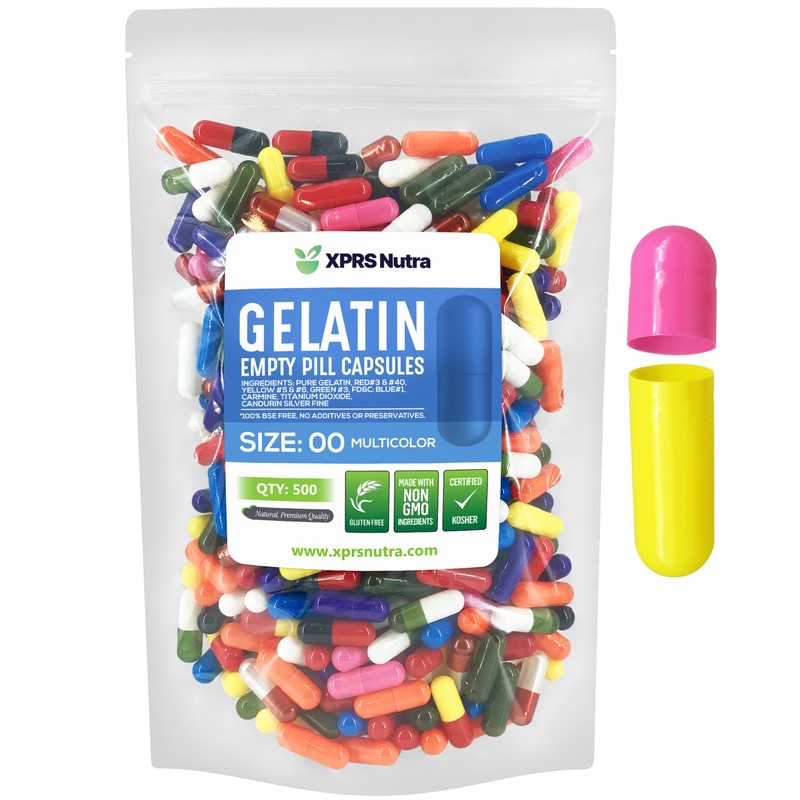 XPRS Nutra Size 00 Empty Capsules - 500 Count Empty Gelatin Capsules - Pill DIY Capsule Filling - Fillable Pill Gel Caps for Do-It-Yourself Supplements (Multi Color)