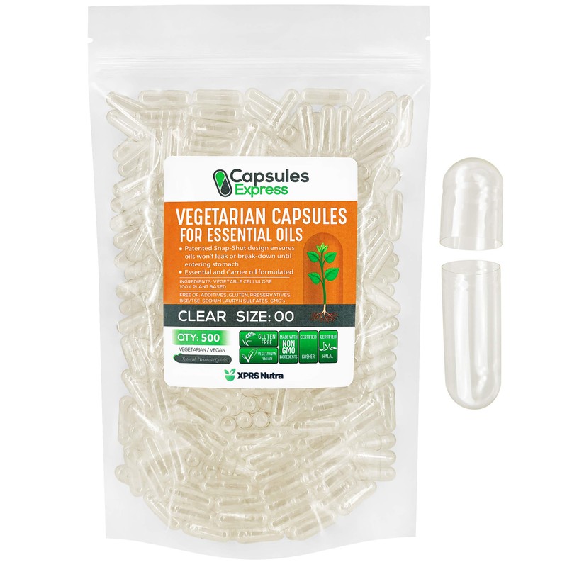 XPRS Nutra Size 00 Empty Vegan Capsules - 500 Count Clear Veggie Capsules for Essential Oils - Empty Vegetable Caps - DIY Filling Works with Most Oil
