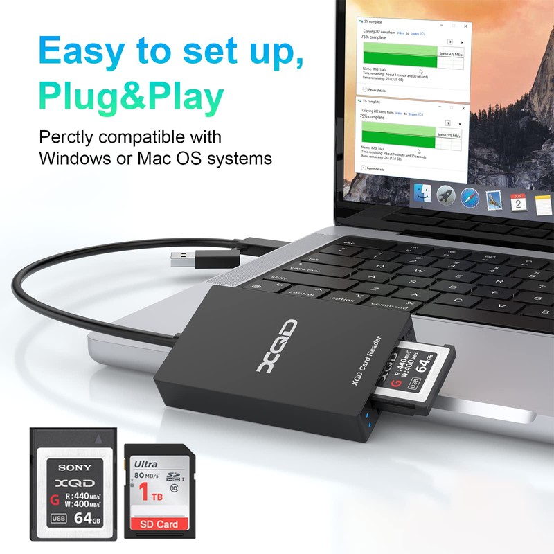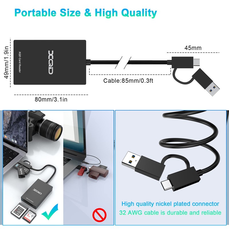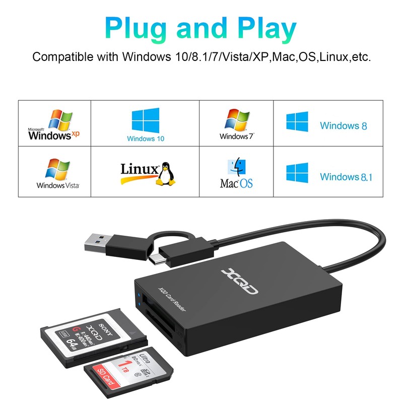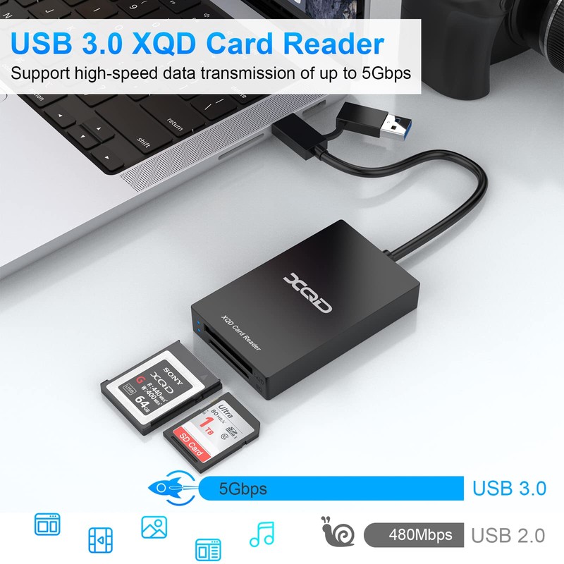 - ✅【Professional USB/USB-C XQD Card Reader】SD/XQD Card Reader Adapter with Two Slots is designed for photographers. The card reader uses a 2in1 USB-C/USB 3.0 port, and one data cable can be used for all XQD/SD card readers. Conveniently download images and videos from XQD card reader to your smartphone/laptop/computer and provide a universal transfer solution between multi-format memory cards and PC or tablet.