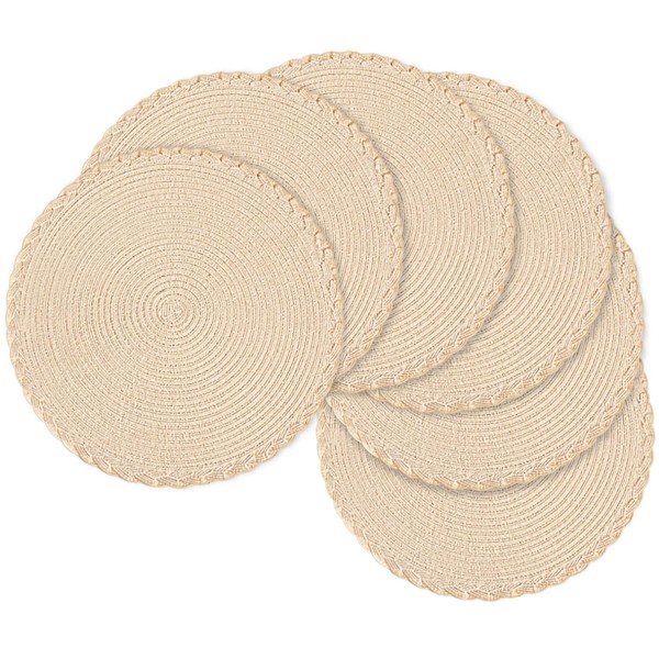 XQIGI Braided Placemats Round Set of 6, Washable Non-Slip Table Mats 14 Inch, Woven Heat Resistant Polyester for Kitchen Dining Table Decor (6, Beige)