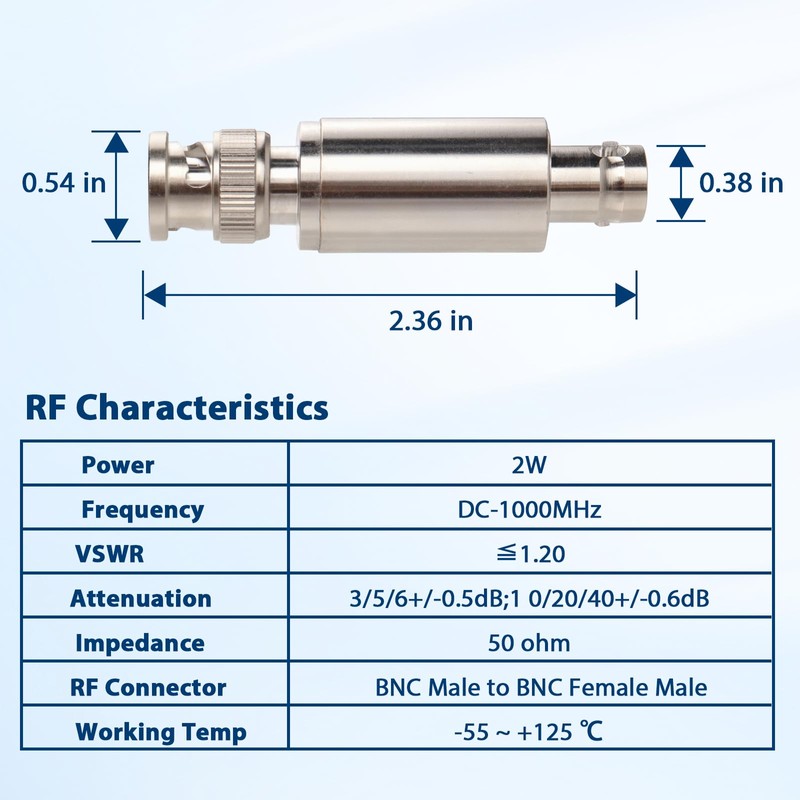 XRDS -RF 2W BNC Male to BNC Female Coaxial RF Attenuator, 20dB Attenuator 50 Ohm 2W, BNC Male to Female Connector, RF Signal Attenuator for Radio and Communication Applications