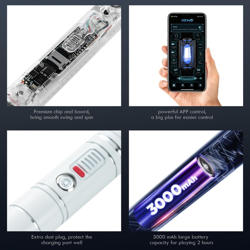 - Sound Fonts and Light Effects - This lightsword has 16 preset sound fonts, infinite and quick color change mode, rainbow blade. 3 light effects, 3 level volume. This RGB light saber combines realistic movie sound effects and flash modes, bring an immersive combat experience. Now, many functions like the light effects, blade mode, battery display, sensitivity, motion control on/off, etc, can also be set on the APP XENO-Configurator.