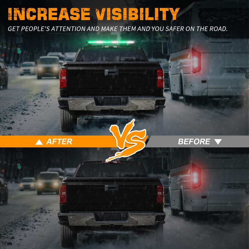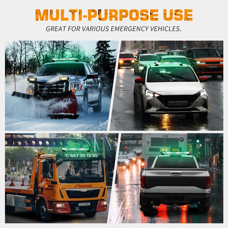 - 【WIDE APPLICABILITY】28.4 inch green and white emergency light bar are suitable for emergency vehicles and trucks, construction vehicles, plow trucks, tractors, security guards, snowplow, postal and mail carriers, city and volunteer cars, law enforcement, etc. Ensuring you and others travel safely.