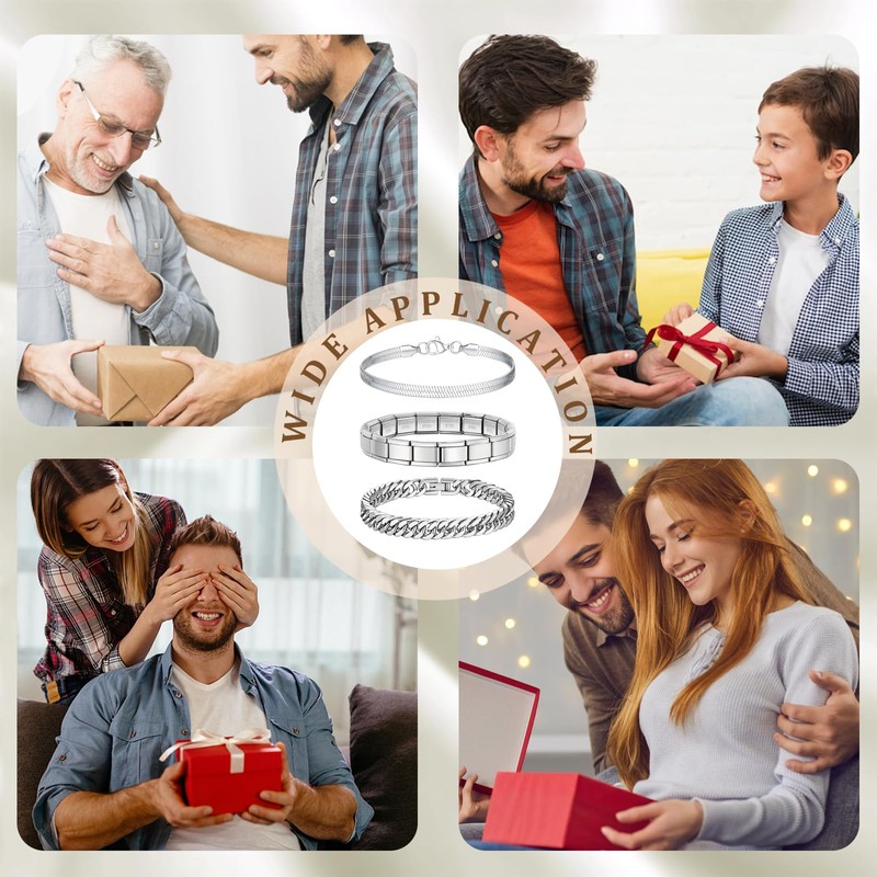 - Mens Bracelets Set:You will get 3 Pcs stainless steel bracelet mens, chain bracelet including 1 Cuban Link Chain Bracelet, 1 Italian Style Charm Bracelets , 1 Herringbone Bracelet. Different styles can meet your daily needs.