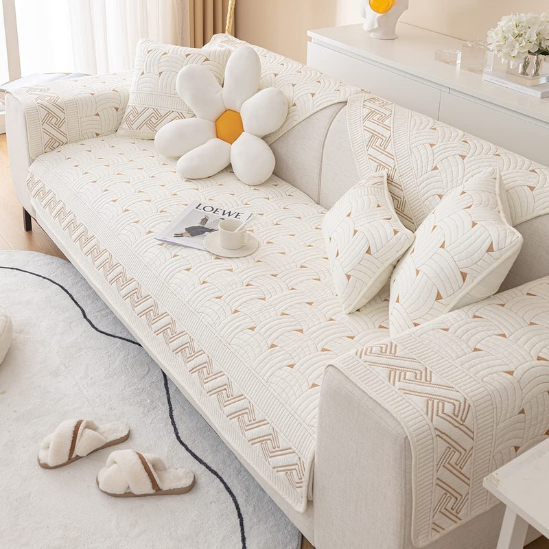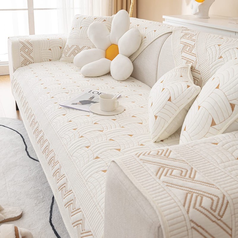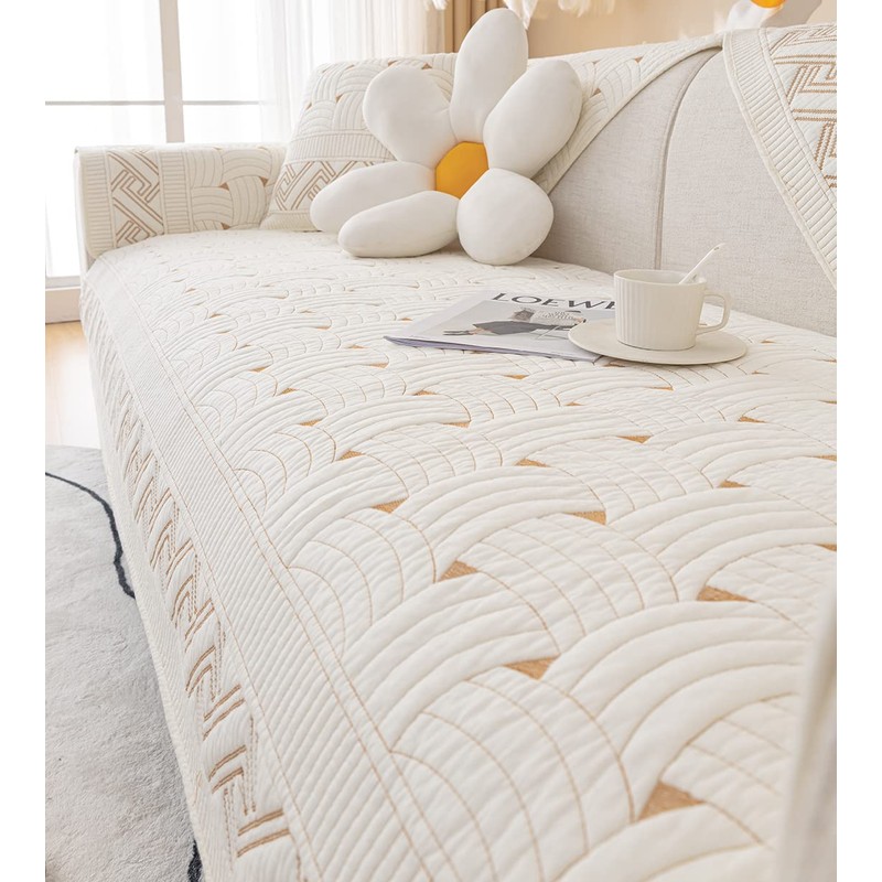 XSlive Farmhouse Cotton Quilted Sofa Cover Weave Pattern Embroidery Sectional Couch Cover Soft Nonslip Sofa Slipcover Furniture Protector Cover for Pets Kids Children Dog Cat (Ivory,36"x63")
