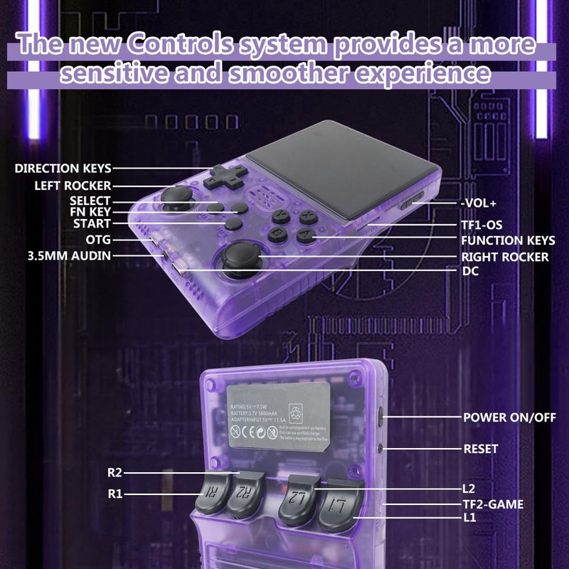 - 【Multifunctional Game Console】This handheld game console is equipped with 1.5GHz 64-bit RK3326 CPU, Mali-G31MP dual-core GPU, 4GB*2 RAM DDR3L; With a Type-C interface Wi-Fi receiver, this PRO Handheld Game Console supports to Wi-Fi connectivity and connection handle for two players. Via a Type-C OTG HD interface adapter, it can be connected to a large screen for home use, such as TV and projector, etc.