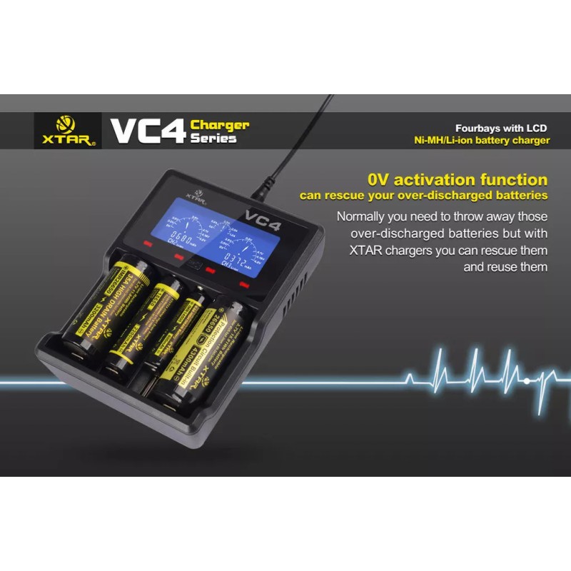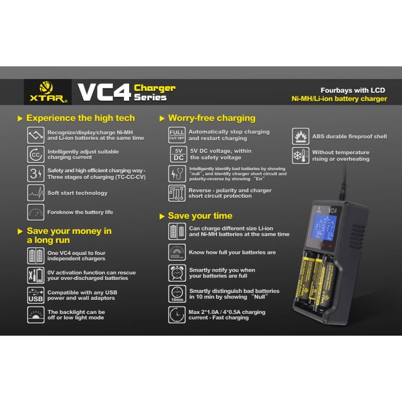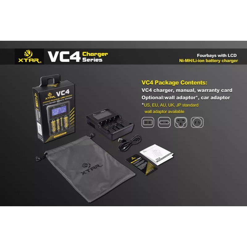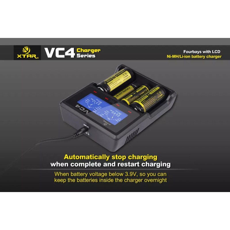 The XTAR VC4 charger is a combination of our XP4C and VC2 charger! This intelligent charger can recognize, charge, and display charging current, battery voltage, and charge capacity of both Ni-MH and Li-ion batteries at the same time! This is a USB powered charger so it can be plugged into any of your existing AC USB wall adapter plugs (e.g. Apple, Samsung, etc.)