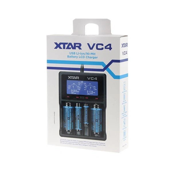 The XTAR VC4 charger is a combination of our XP4C and VC2 charger!  This intelligent charger can recognize, charge, and display charging current, battery voltage, and charge capacity of both Ni-MH and Li-ion batteries at the same time! This is a USB powered charger so it can be plugged into any of your existing  AC USB wall adapter plugs (e.g. Apple, Samsung, etc.)