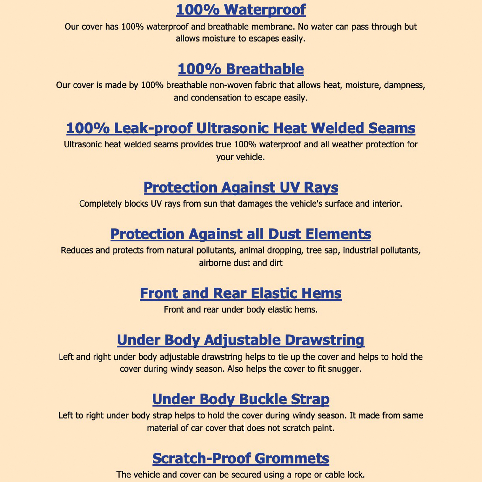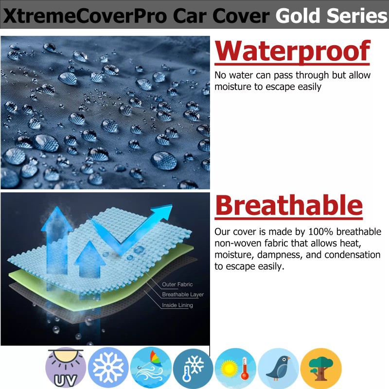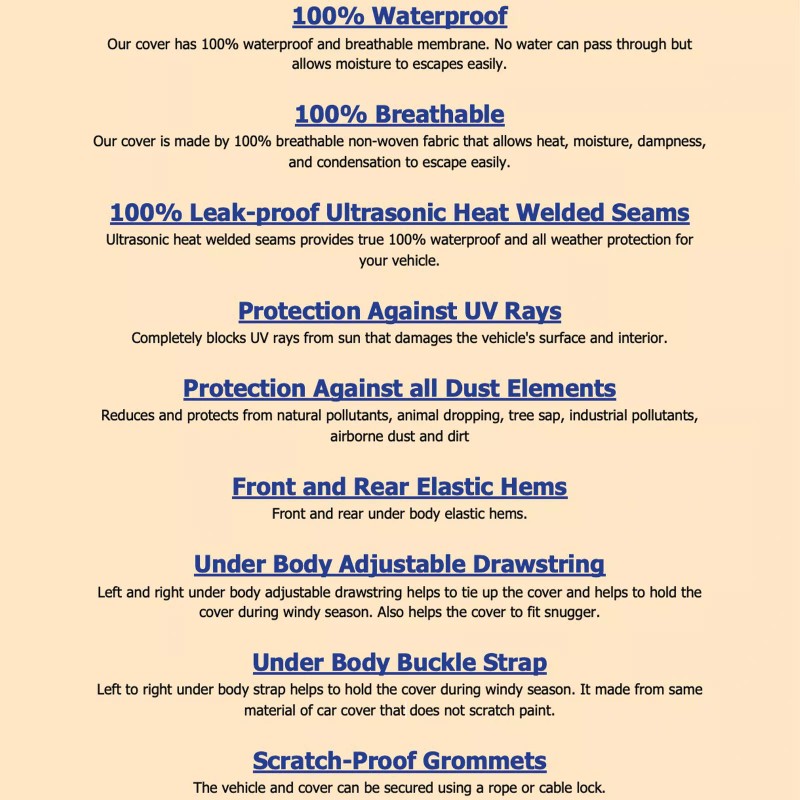 - Features: Breathable, Elastic Hem, Grommet Hem, Mirror Pockets, Non-Abrasive Lining, UV-Resistant, Waterproof, Water Resistant