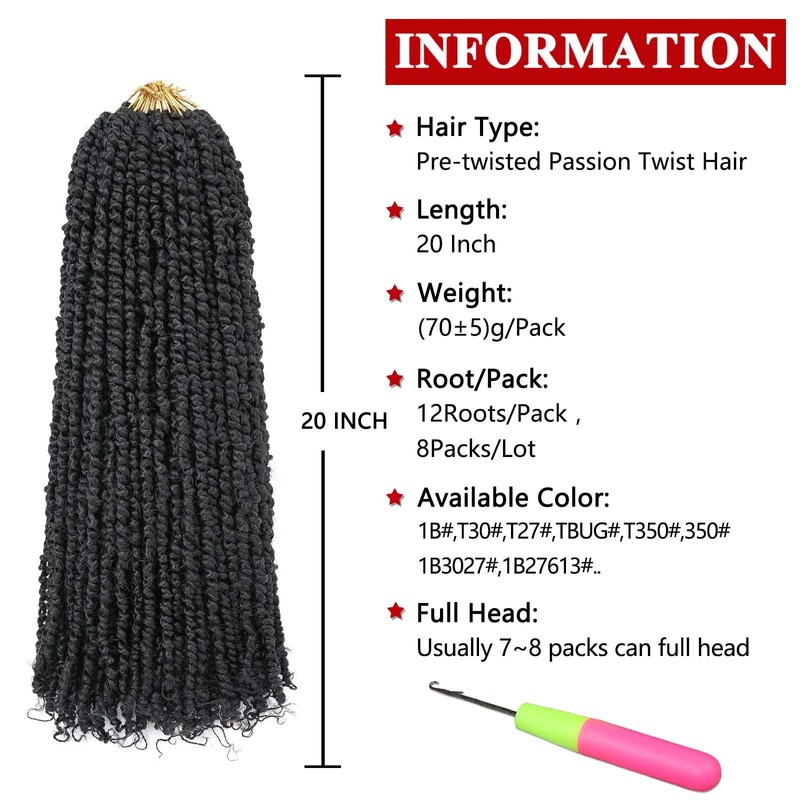 - 【Package】8 packs 20 inch crochet passion twist hair. 70g/pack, 12 Strands/pack, 96 Strands in total. 8 packs can make a full head.