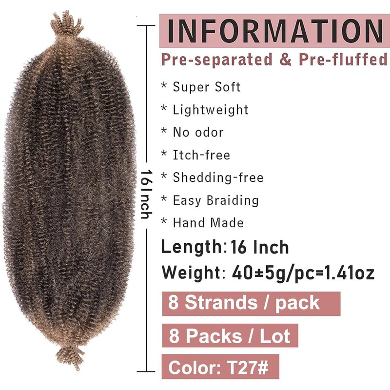 Xtrend 8 Packs Springy Afro Twist Crochet Hair 16 Inch Pre-Separated Spring Twist Hair Synthetic Marley Crochet Braiding For Distressed Soft Locs Hair Extension For Women (8 Strands/Pack,T27#)