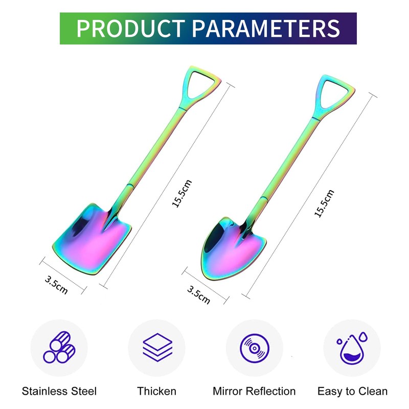 - Creative design: this shovel spoon has a shovel-shaped spoon and pointed shovel in two creative shapes. Cute appearance is colourful, very interesting. The end is equipped with a triangular trough, which is easy to store and can be hung on the kitchen wall. Suitable dimensions do not take up too much space.