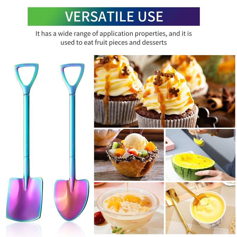 - Set of 32 dessert spoons: 16 pointed scoops and 16 scoop spoons. Shovel spoon stainless steel can be reused. It can not only save costs, but also protect the environment and reduce plastic pollution. Four colours are selected, the unique colour design makes you look very unique and have personal features. The quantity and colours are enough for your daily use.