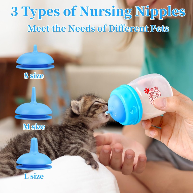 - 3 Styles Nipples: Small/Middle/Large size meet different newborn pet feeding needs, designed by a professional veterinarian, mimics the shape of a pet mother's pacifier, made of food grade silicone, soft and safe, resistant to tearing and biting, all nursing nipples are pre-made 1mm small hole, do not need to cut the nipple.