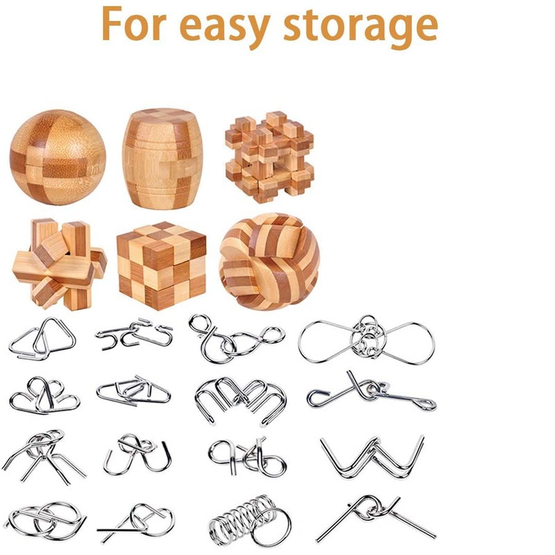 - 【Metal and Wood Brain Teaser Puzzle set 】 Include 4 wooden 3D puzzles and 16 different iron metal puzzles. All the wood puzzles and metal wire puzzles are smooth and have NO SHARP EDGES. The perfect size makes it easy for both hands, big and small.