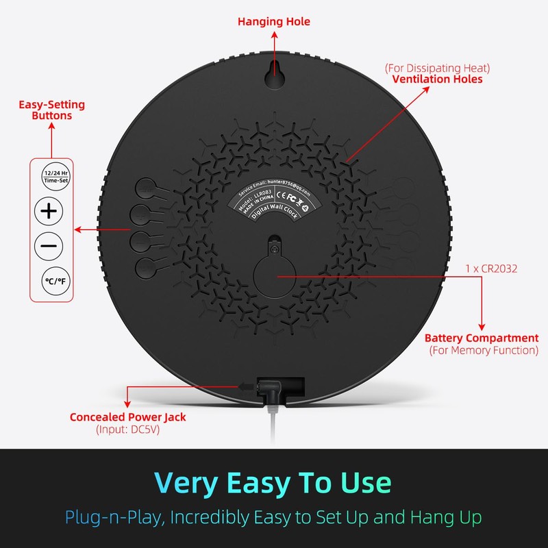 • VERY EASY TO USE: This PLUG-IN wall clock is extremely easy to set up and the 10Ft long USB Cable makes it possible for you to hang it wherever you want.