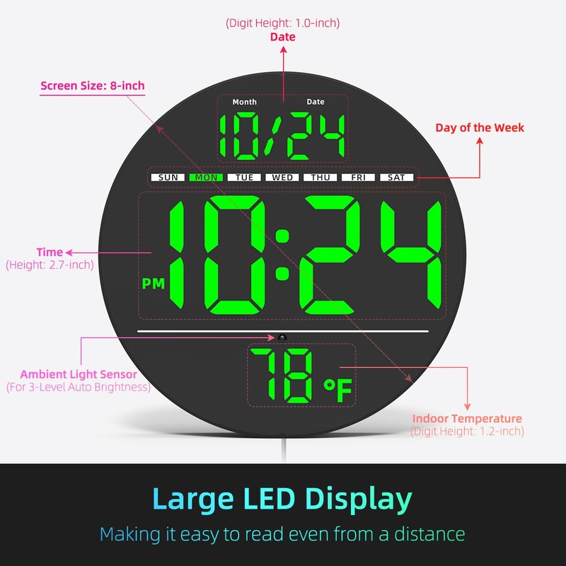 • 8-INCH LARGE LED DISPLAY: The full screen LED display (with up to 2.7-inch big digits) allows you to read clearly in a far distance. Especially user friendly for those who with eyesight problems.