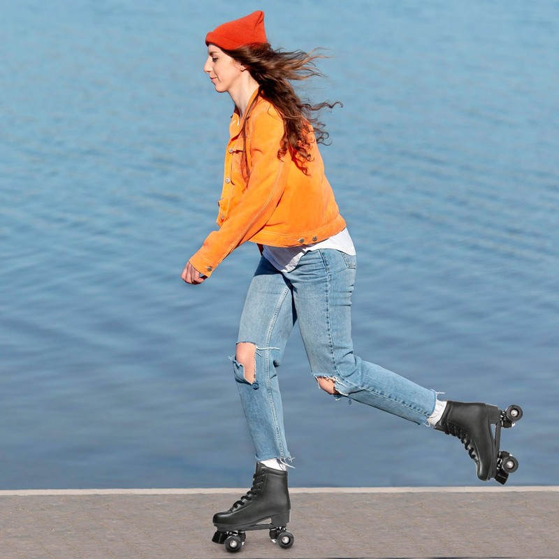 - ❤【Premium Faux Leather Material】The surface of the roller skates is high-quality smooth and textured Faux Leather, and the material inside is comfortable white velvet cloth, paired with a porous design, making your feet feel comfortable and breathable during skating. We have incorporated the classic and fashionable black color into the design of roller skates, creating a stylish, classic, and versatile appearance.