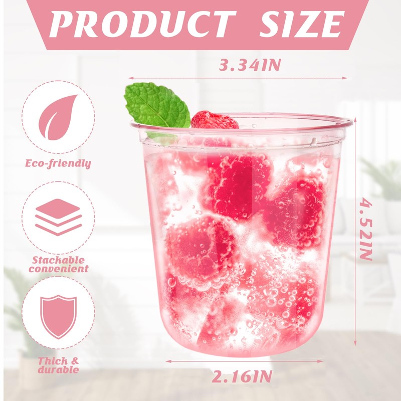 Xuelimei 12oz Disposable Stemless Glasses,PET Disposable Drinking Cups,Cold Party Clear Plastic Wine Glasses for Parties Birthday,Wedding,Meeting,Christmas Party Supplies. (150, Pink)