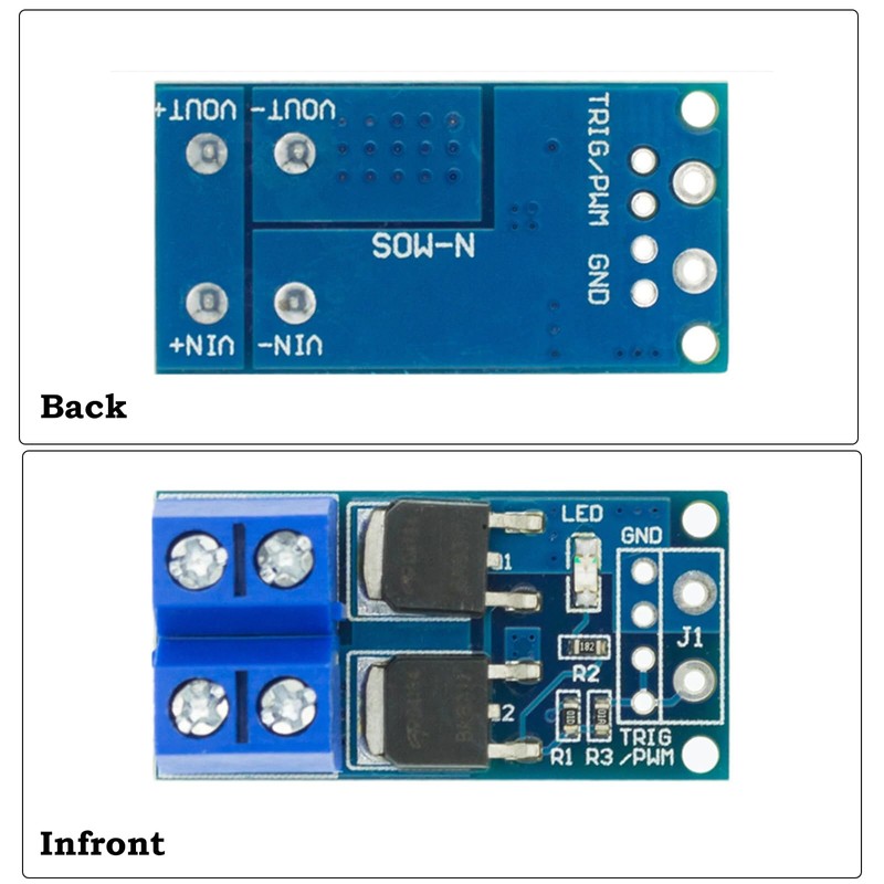 - Versatile Applications – Suitable for controlling high-power DC loads such as motors, fans, light bulbs, LED strips, micro water pumps, solenoid valves, and more. Ideal for DIY electronics, robotics, smart home, and industrial automation projects.
