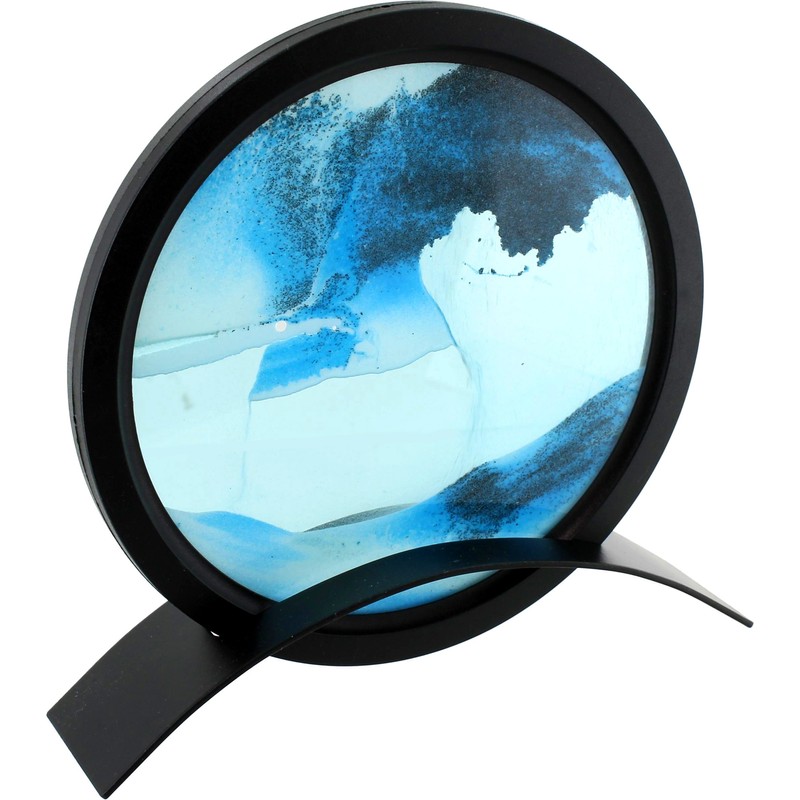 - Blue circle sand art creates mountain, ocean, valley and dune patterns as the sand trickles down