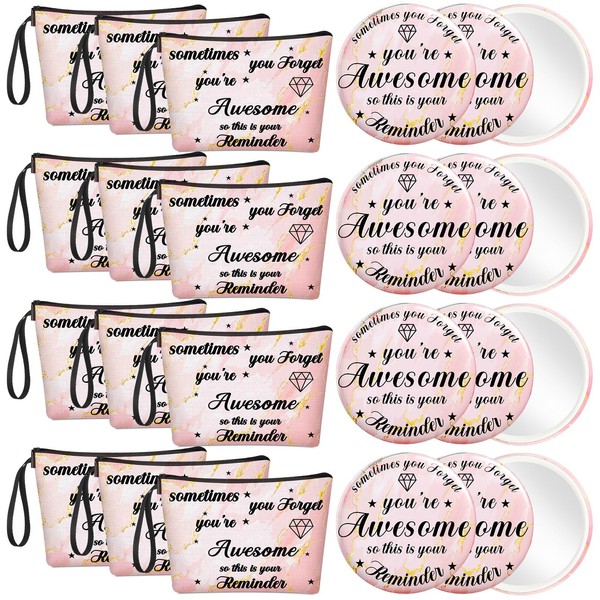 Xuniea 24 Pcs Inspirational Gifts for Women Bulk 12 Motivation Canvas Makeup Bags 12 Round Portable Pocket Mirror You're Beautiful Awesome Appreciation Gifts for Women Coworker Nurse (Awesome)