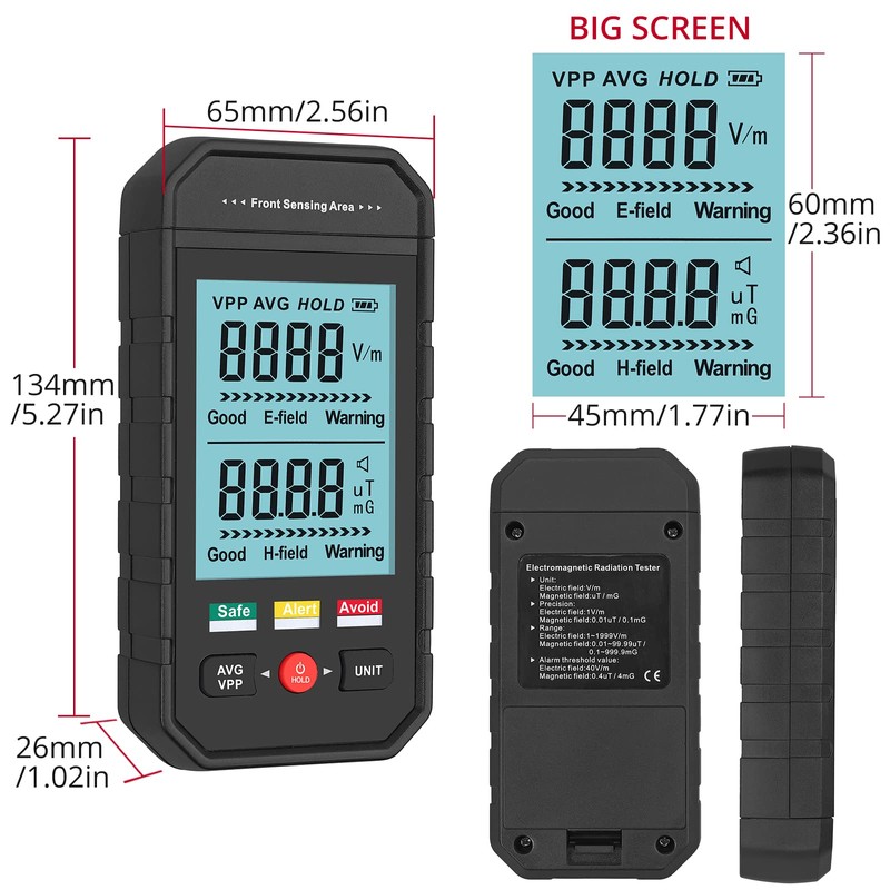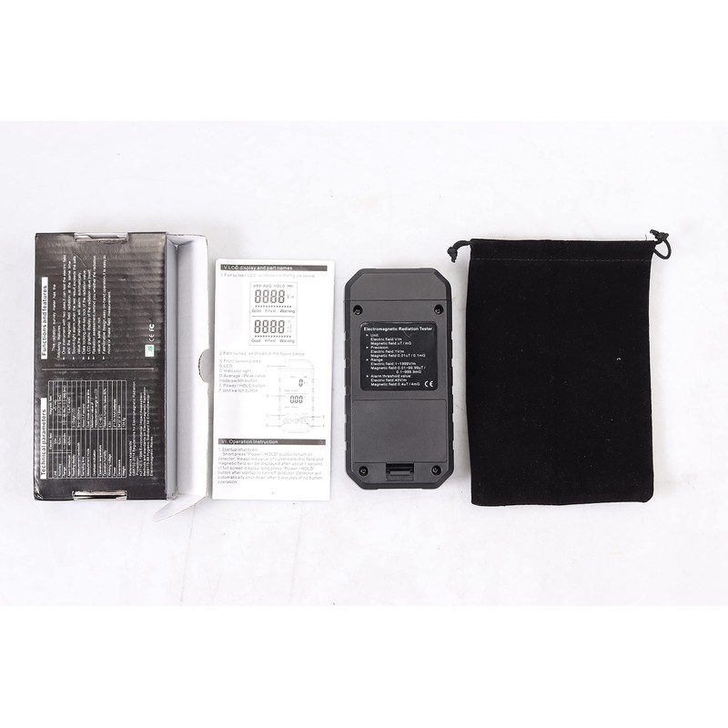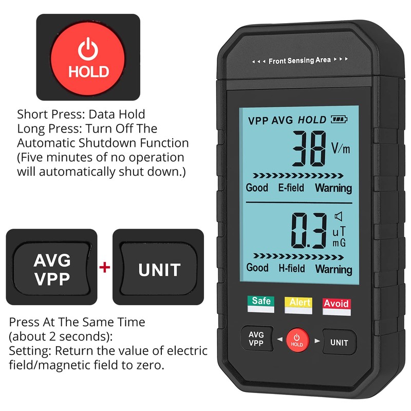 - 【Easy and Convenient to Use】Data retention to lock Peak Value (Maximum)/Average Value by one key for review. It is a good helper to check out whether the place is radiation-free. Measure both magnetic field radiation and electric field radiation at same time clearly and accurately. One-handed operation, easy to move for on-site measurements, effectively identify the signal source and locate the signal position. Auto power off after 5 minutes without operation