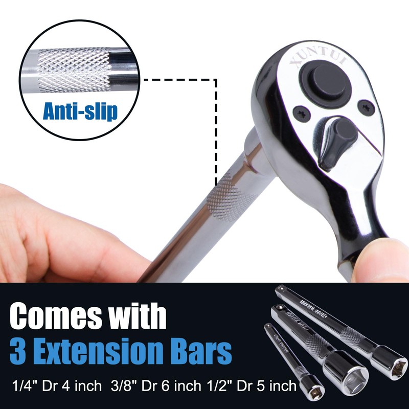 XUNTUI Stubby Ratchet Wrench Set with Extensions, 6-Piece, 1/4 to 1/2 inch Drive, Chrome Steel