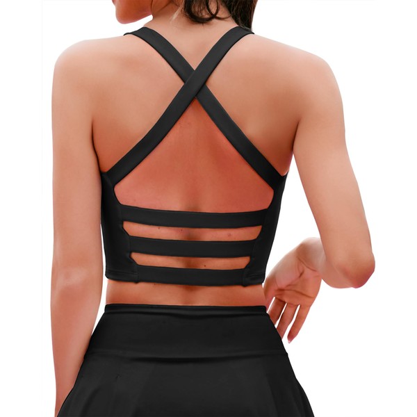 XUNYU Women Longline Sports Bra Strappy Workout Tank Tops Built in Support Open Back Criss Cross Yoga Crop Shirt, Black Sports Bra, Small