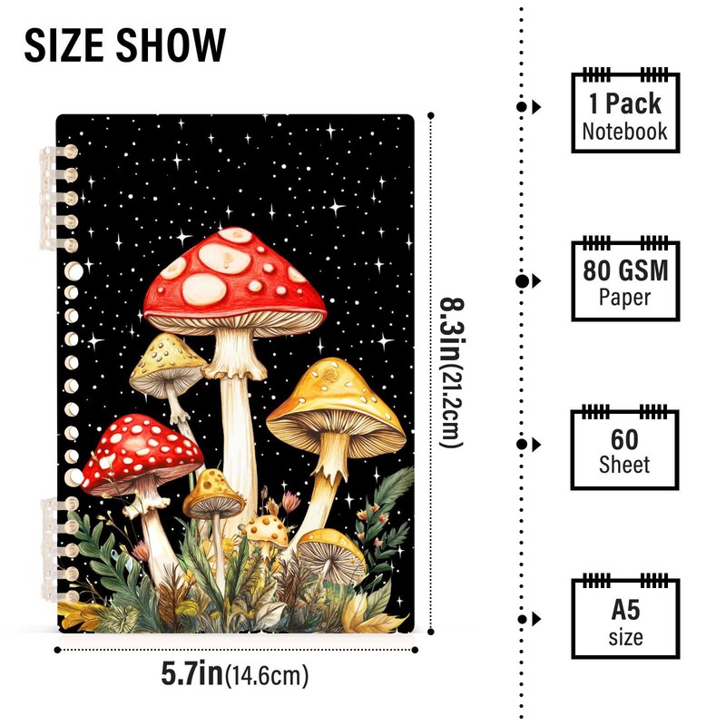 XUWU Mushrooms Spiral Notebook with Removable Circle Ring for College Office Work Ruled Journal A5 8.3"x5.7" 60 Sheets