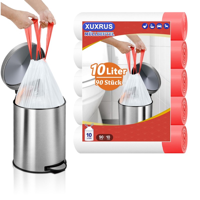 XUXRUS Bin Liners 10 Litre Bin Bags with Drawstring, Pack of 90 Bin Liners with Carry Handle White Waste Bag