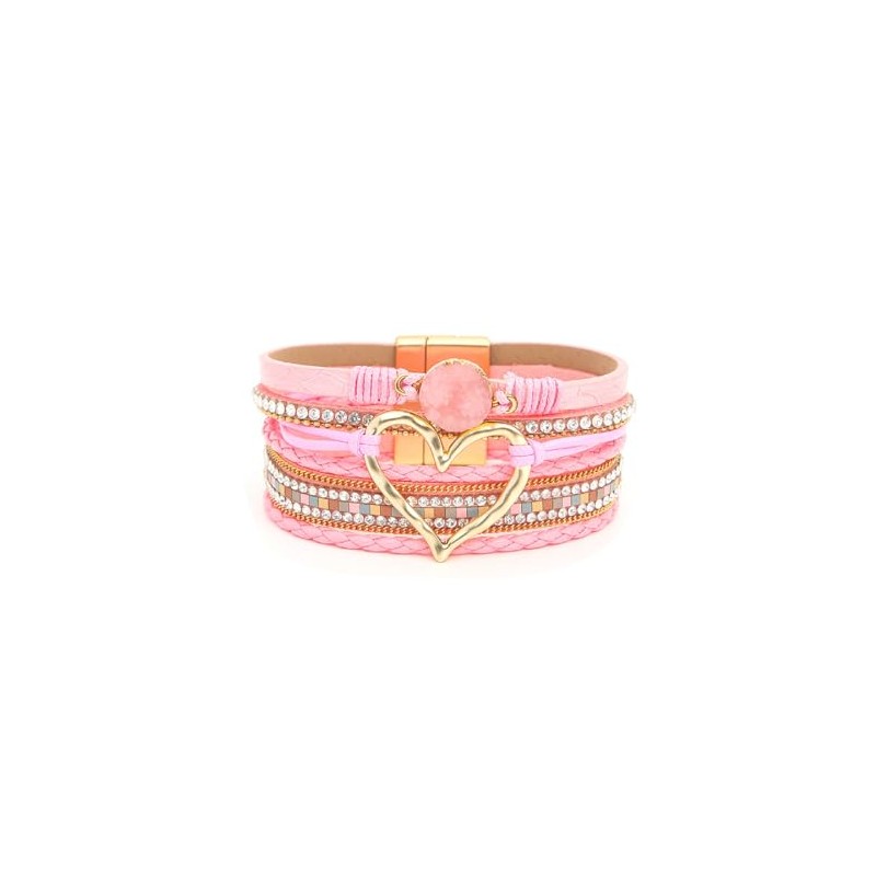 - Leather Band Bracelet-The multi strand bracelet is decorated with shinny cubic zirconia, gold heart and druzy quartz.
