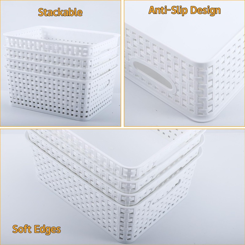 • Material: The plastic storage baskets are made of thick plastic, durable and can be use for a long time. The basket features a woven design with tightly spaced vents, making it easy to dry after washing, making it a ideal choice to organize your items