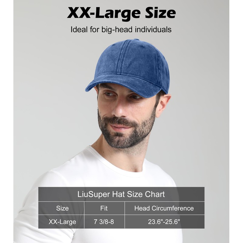 - Introducing our latest creation, the LiuSuper XXL Baseball Cap. Designed specifically for those with larger heads, our caps offer both style and comfort in equal measure. Crafted from vintage washed distressed cotton, our dad hat boasts a classic and timeless look that never goes out of fashion.