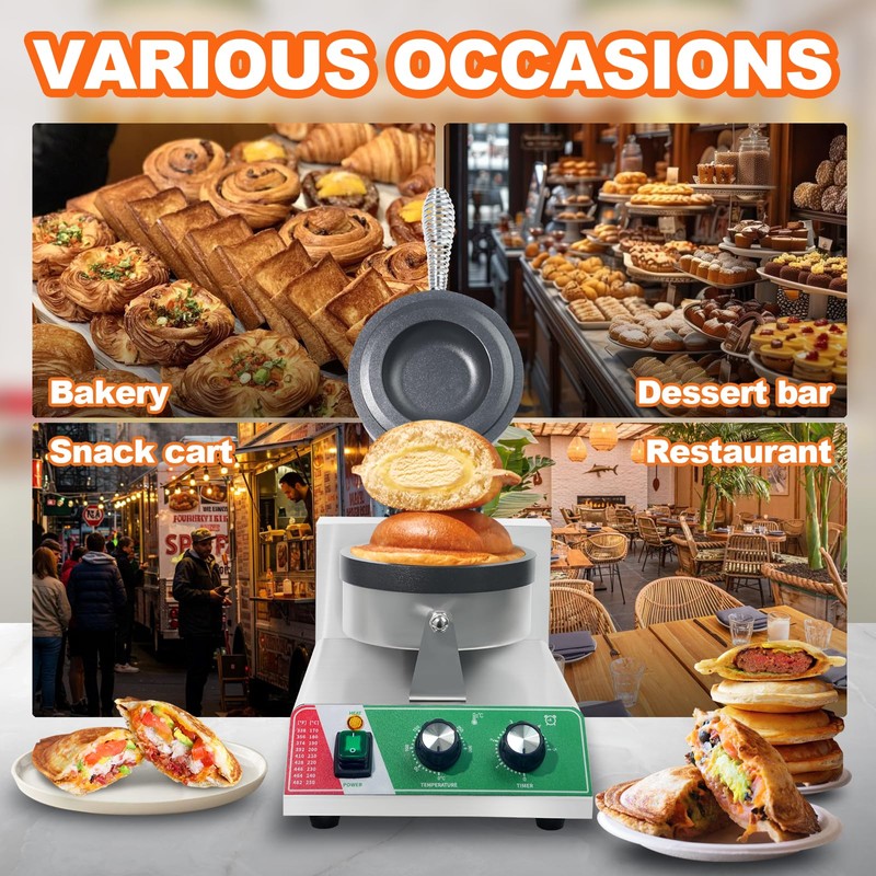 • Timed temperature control:This commercial electric ice cream sandwich maker features adjustable temperature (50-300°C/122-572°F) and time (0-5 minutes) control knobs for customized baking