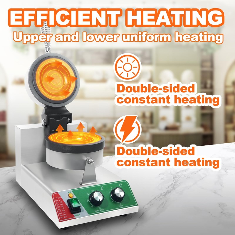 This ice cream waffle maker features double-sided heating, ensuring even cooking on both sides without the need for flipping. It also comes with independent temperature control knobs (50-300°C / 122-572°F) and a timer (0-5 minutes).