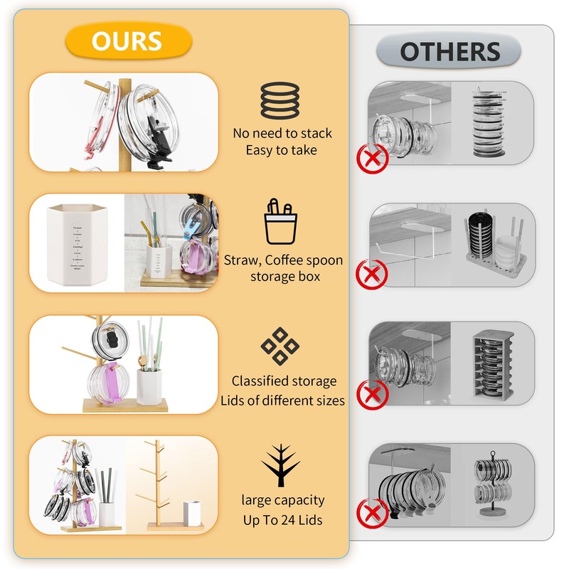 - [Unique Tree Shape] Our cup lid holder features a unique tree-shaped design that provides more storage capacity. Each branch holds 2 to 3 cup lids, with a total capacity of approximately 18 to 24 cup lids. Easily store and access your lids without the hassle of stacking.