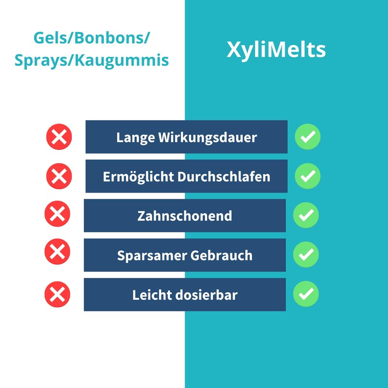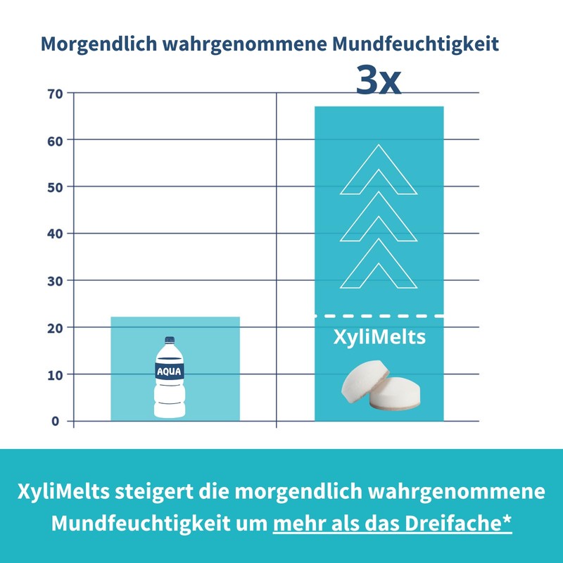 - MORGENS FEUCHTE FRISCHE IM MUND: XyliMelts steigert die morgendlich wahrgenommene Mundfeuchtigkeit um mehr als das 3-fache. Wachen Sie mit XyliMelts morgens so wach und erfrischt auf, als hätten Sie aus einem kristallklaren Gebirgsbach getrunken.