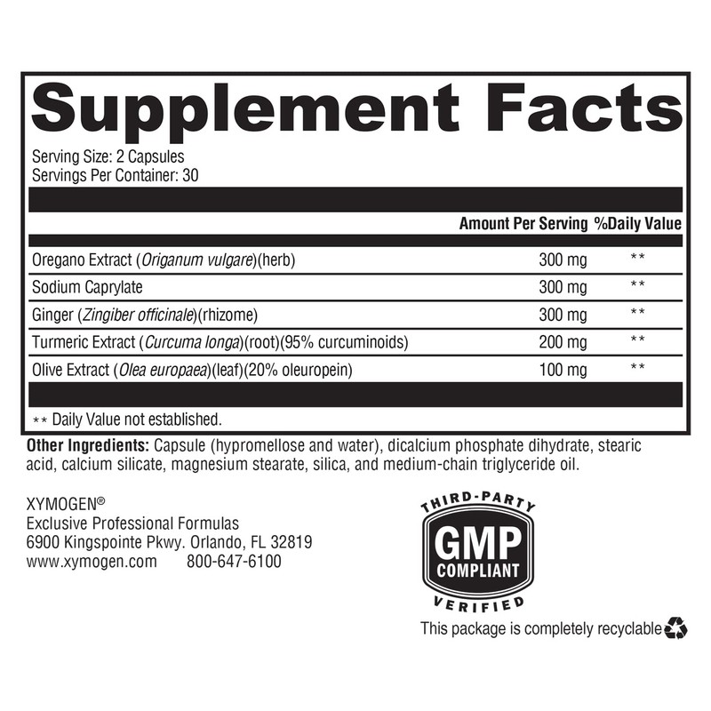 - Also includes oregano extract, turmeric, ginger, and olive leaf extract standardized to 20% oleuropein.
