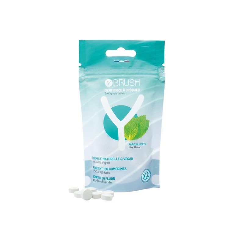 - Innovative and natural pastillets: Y-Brush offers a toothpaste that reduces waste, with fluorine 1088 ppm (also available without fluorine) and made in France. It is 100% natural origin and has a mint taste. This pack contains 2 months of brushing time.