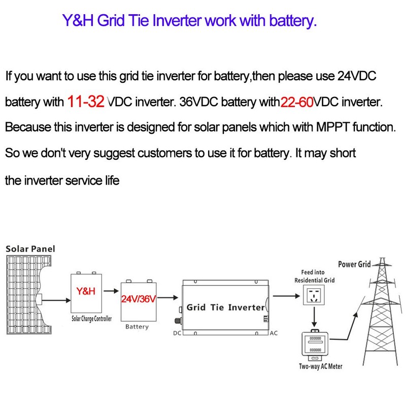 Y&H grid tie inverter is designed for solar panels. The working voltage of solar panels depends on the intensity of sunlight, which means that the panel voltage varies. There is also an increase in voltage at the moment the solar panel starts.