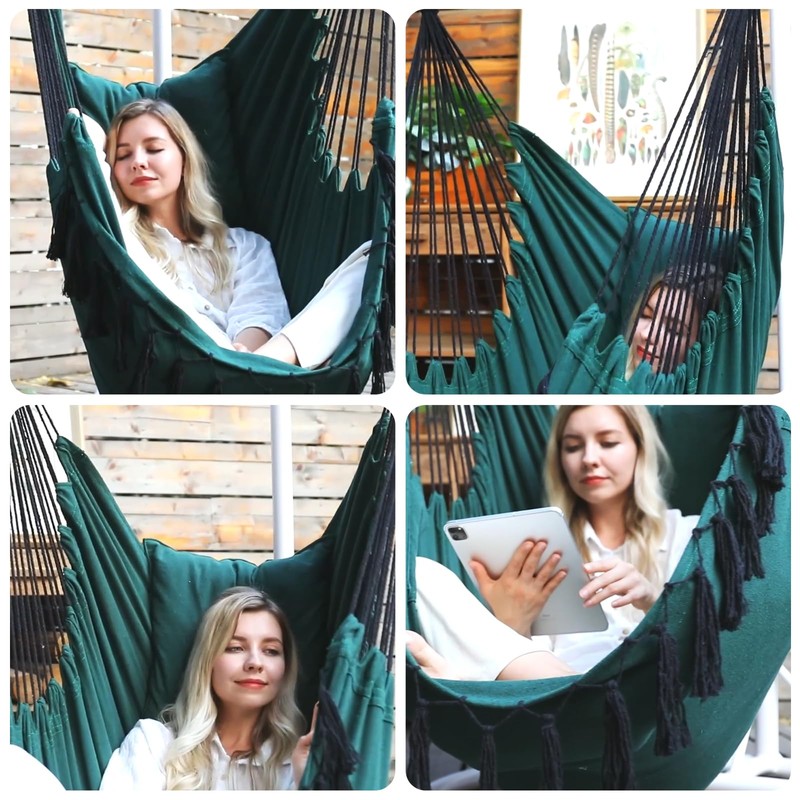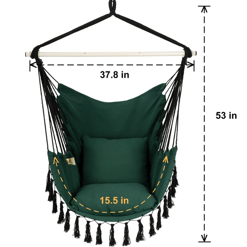 Y- STOP Y- STOP Hammock Chair Hanging Rope Swing, Max 500 Lbs, 2 Cushions Included, Large Macrame Hanging Chair with Pocket for Superior Comfort, with Hardware Kit, Green
