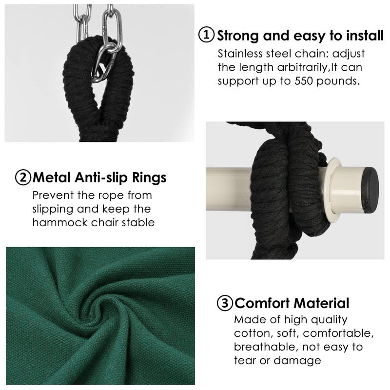 - hammock chair: Safe and strong , the sturdy spreader bar makes the hammock chair more stable. The anti-slip grooves on both sides can effectively prevent the rope from sliding, and the maximum weight is up to 500 Lbs