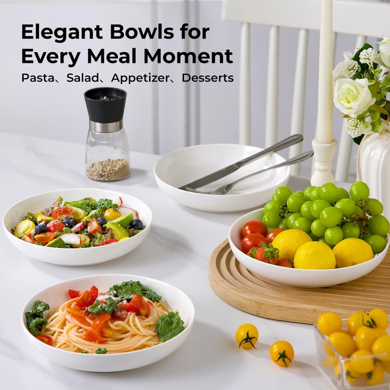 - Wide and Shallow Design: these salad bowls designed with practicality in mind, our salad bowl has a moderate weight that strikes the perfect balance between durability and ease of use.Additional,featuring a modern and minimalist design with a classic white finish and smooth glaze, these bowls complement any table setting and enhance dining experience.