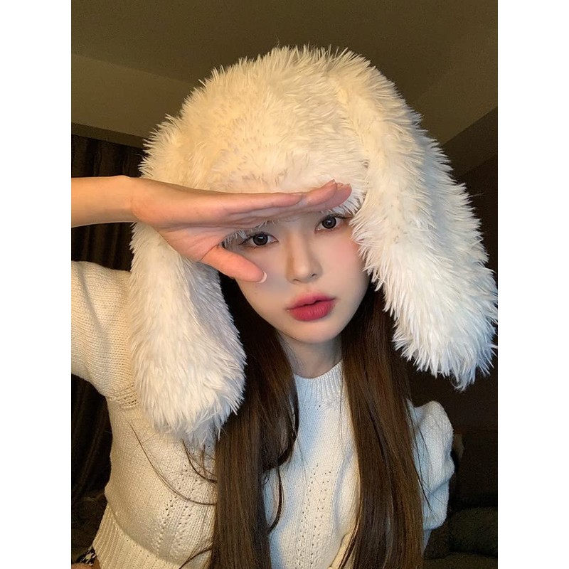 Y2K Fuzzy Bunny Hat for Women Cute Plush Beanie with Bunny Ears Long Rabbit Ears Winter Hat (White)
