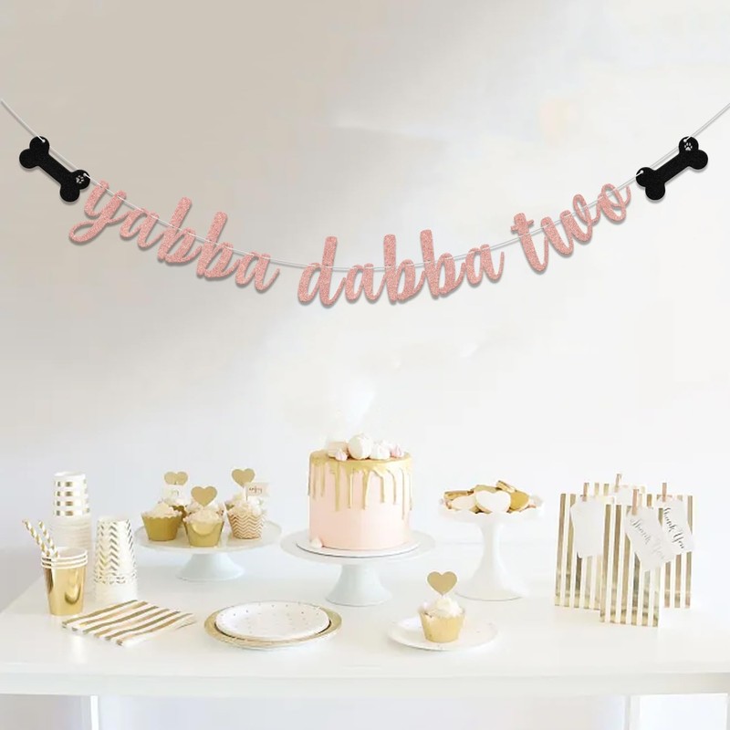 Yabba Dabba Two Banner, Flinstones 2nd Birthday Decorations, Born Two be Wild, 2 Years Old Baby Party Decor Supplies Rose & Black Glitter