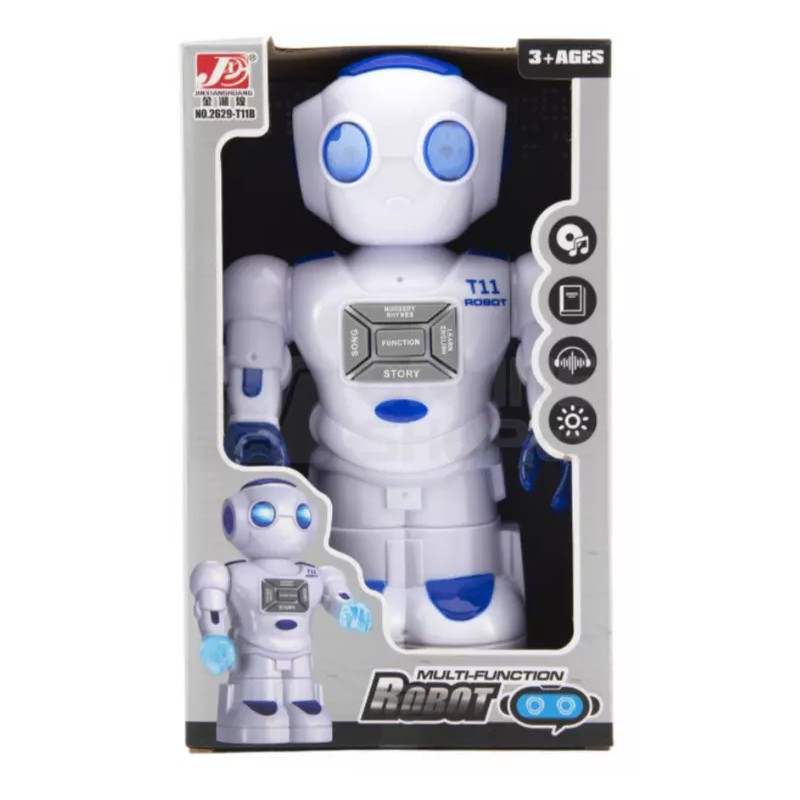 - This robot walks, rotates 360 degrees, reproduces the sounds of shooting, speaks the language of robots, has a bright backlight.