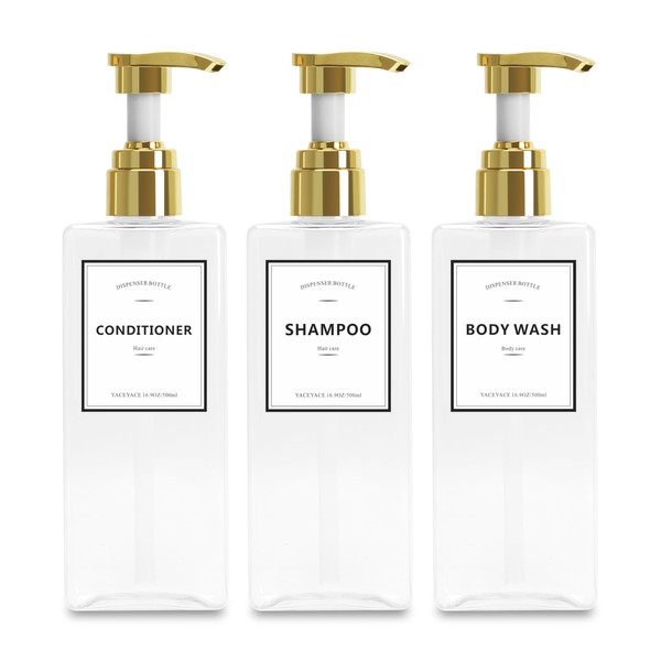 YACEYACE Clear Rectangular Shampoo and Conditioner Dispenser with Gold Pump, 3Pcs,16.9oz